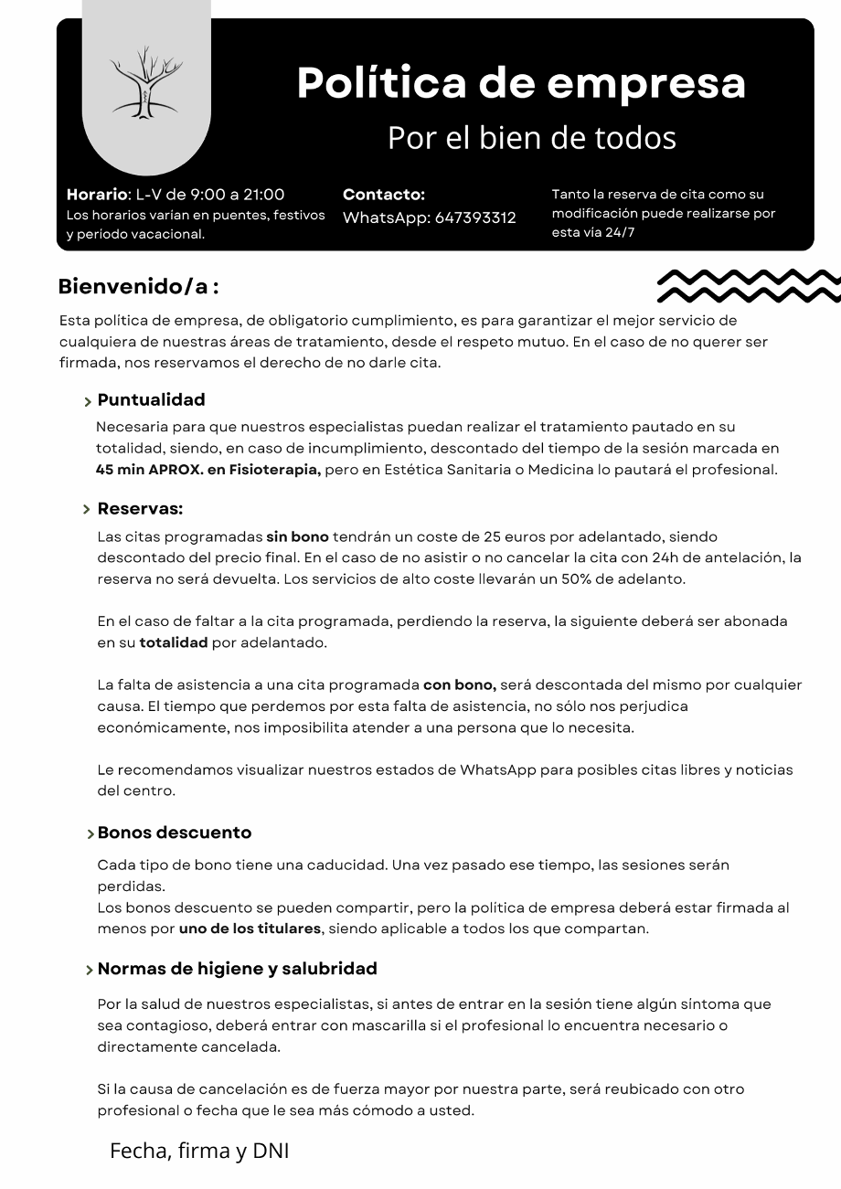 Llevamos más de 17 años atendiendo a nuestros pacientes y para que tengamos una convivencia y asistencia como mereces, y como merecemos los profesionales del equipo de Centro Tándem, hemos elaborado una política de empresa que hará todo más fácil. Será de obligatorio cumplimiento y firma la primera vez que asistas a nuestro centro. Te trataremos como mereces, como nuestras mejores habilidades y cariño.